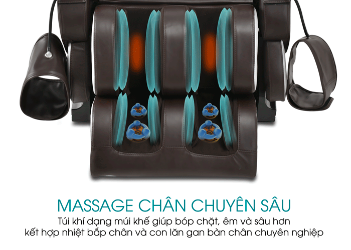 Ghế tích hợp bi lăn chân chuyên biệt với tốc độ cho bạn tự do lựa chọn, kết hợp cùng các túi khí xung quanh bắp chân để bài massage thêm thư giãn, hiệu quả. Khi hoạt động, con lăn sử dụng kỹ thuật xoa bóp, massage toàn diện từ ngón chân tới gót chân.