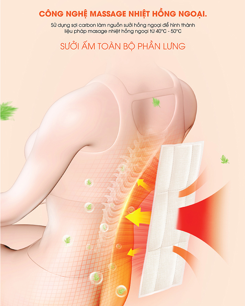 Chế độ nhiệt hồng ngoại 40-50c sưởi ấm lưng. Việc massage kết hợp với chế độ nhiệt làm nóng một cách thích hợp có thể giúp cho hiệu quả massage được tốt hơn.