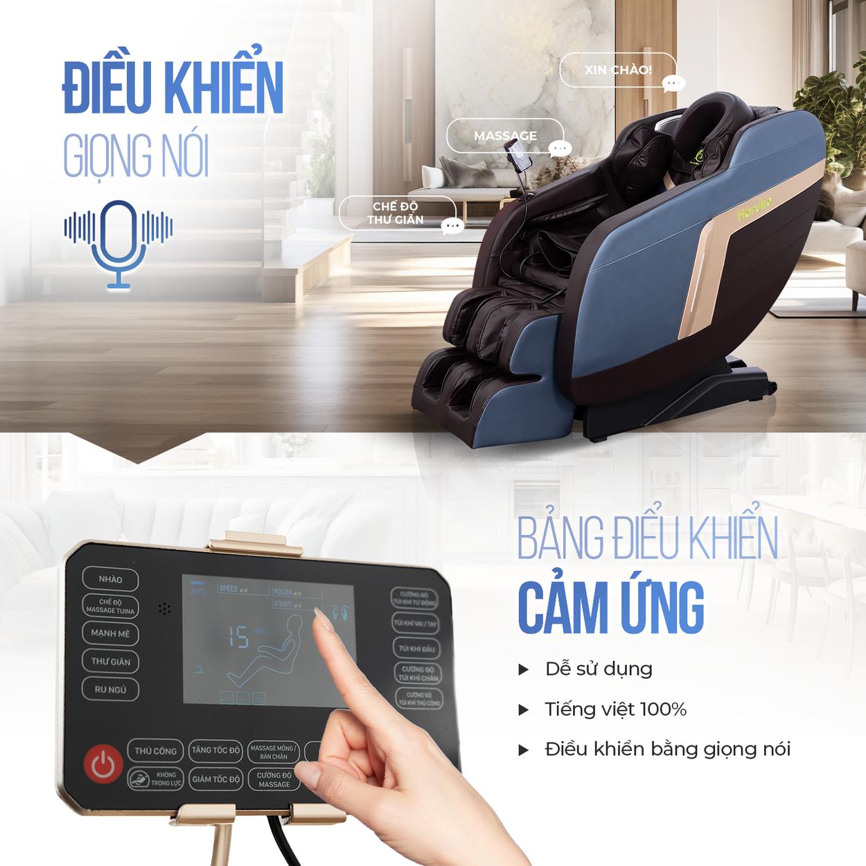 Với bộ điều khiển giọng nói Tiếng Việt, tích hợp tất cả các câu lệnh điều khiển, ghế Massage Haruko H7 giúp người dùng sử dụng các tính năng của sản phẩm một cách dễ dàng và tiện lợi hơn.